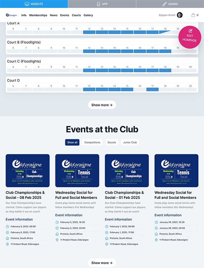 Take full control of your club’s digital presence. Our integrated CMS streamlines your club’s online presence, making it easy to manage and promote your services. Create news pages, photo galleries, events, and an online shop—all at no extra cost.